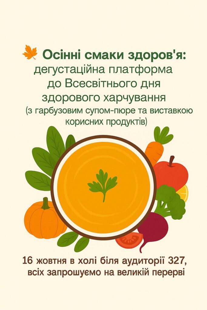 Кафедра готельно-ресторанної та курортної справи факультету туризму Карпатського національного університету імені Василя Стефаника запрошує всіх на дегустаційну платформу «Осінні смаки здоров’я», присвячену Всесвітньому дню здорового харчування. Вас чекає гарбузовий суп-пюре, виставка корисних продуктів та приємна атмосфера осені! 16 жовтня Хол Читати далі